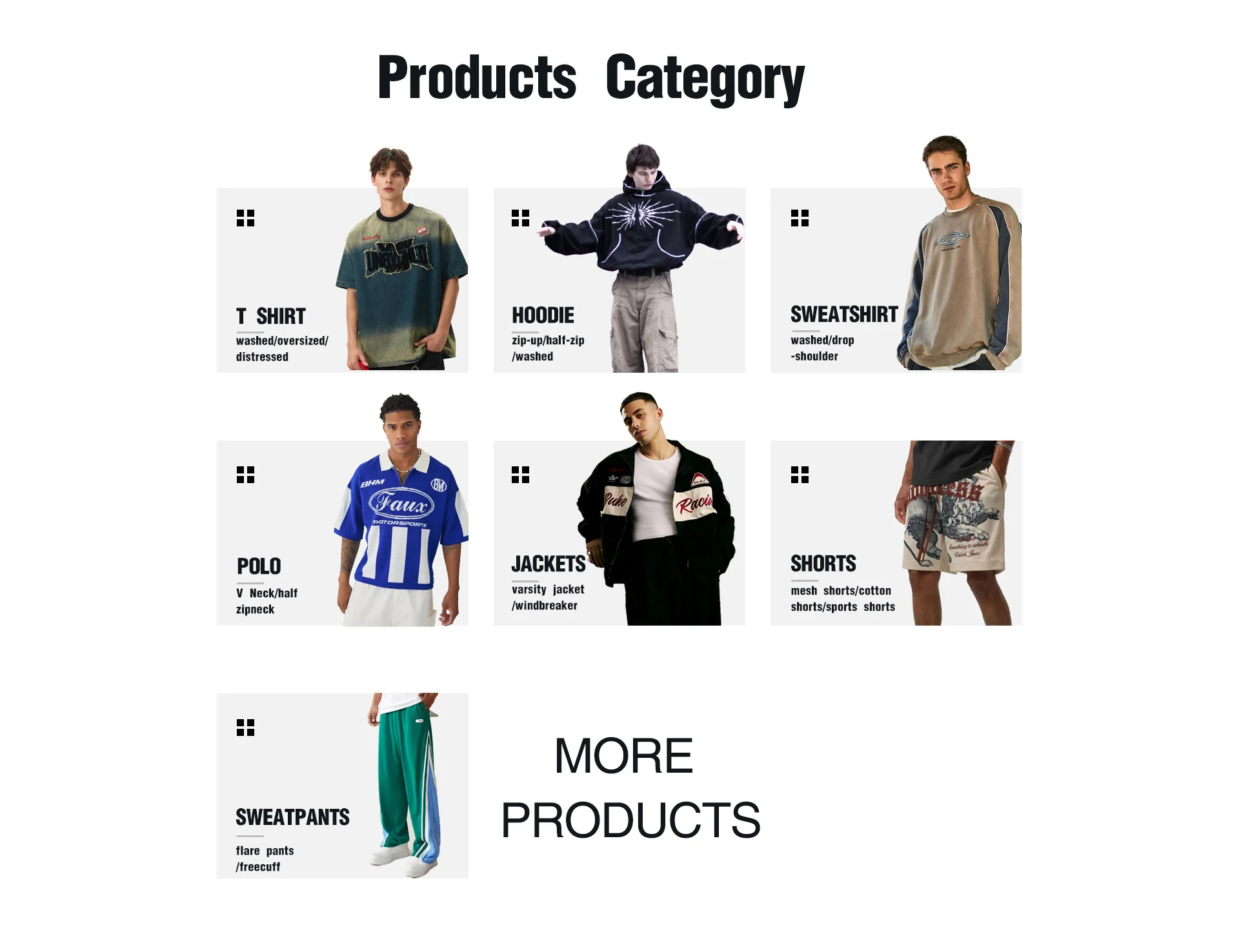 Belangrijkste producten:Hoodies en sweatshirts, t-shirts, broeken, donzen jassen en jacks, poloshirts